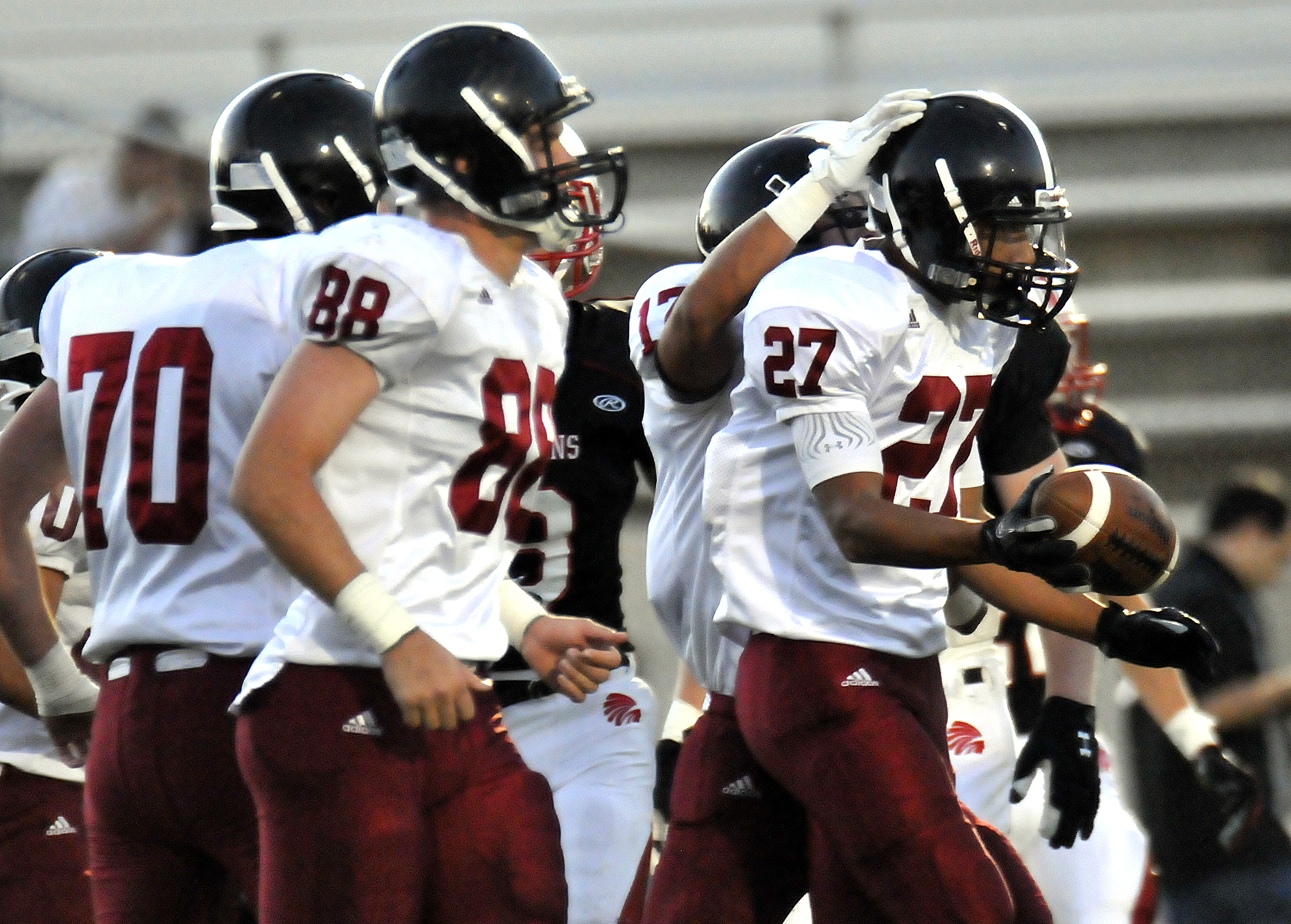 Wide receiver Eric Mayo (27) celebrates his score in the first quarter on Friday, Sept. 21, 2012, at the SM North District Complex.