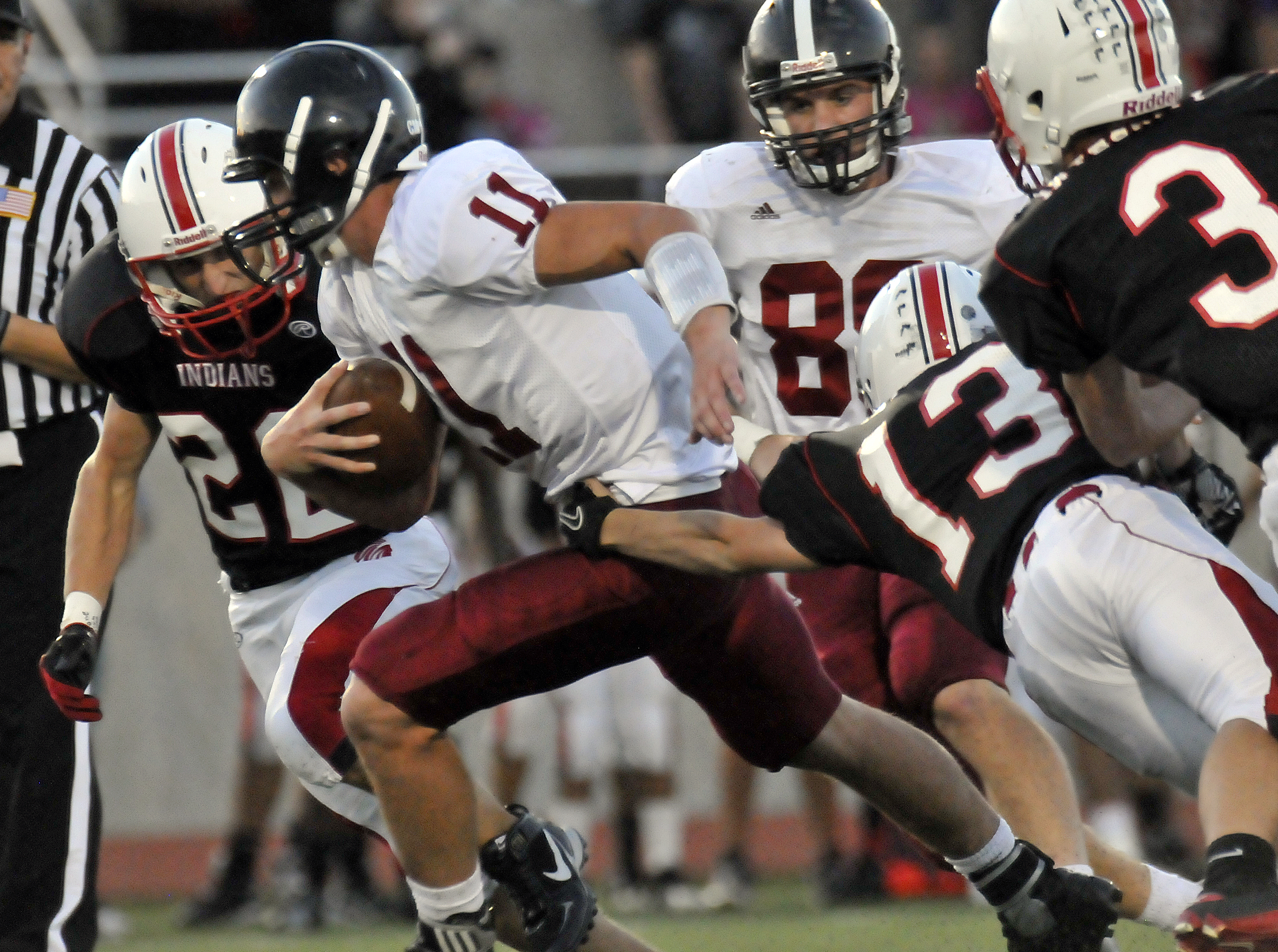 Lawrence quarterback Brad Strauss (11) keeps the ball in the first quarter to score Friday, Sept. 21, 2012, at the SM North District Complex.