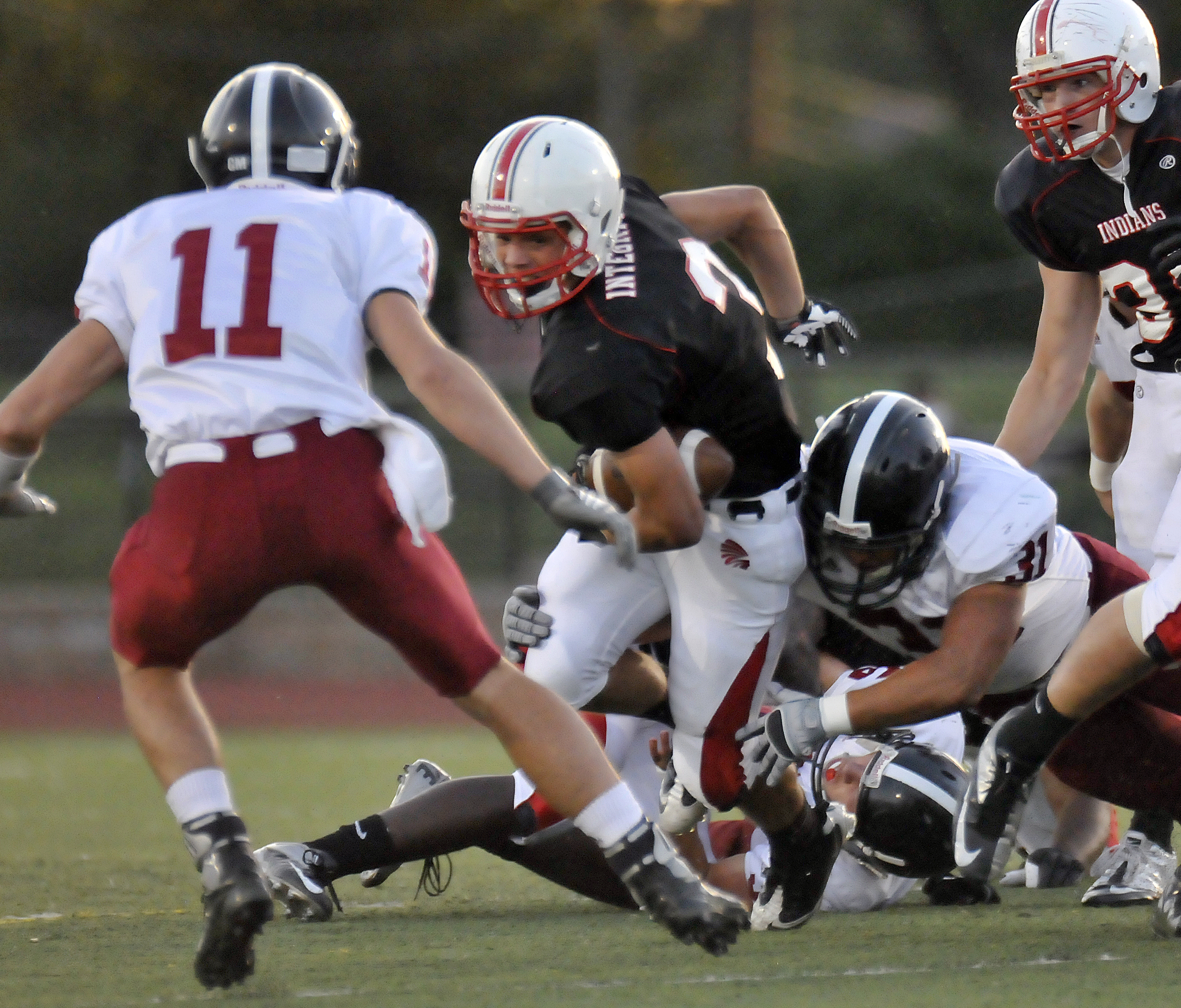The Lawrence defense of Jordan Brown (31) slows the forward progress of Shawnee Mission North's Jesse Patterson on Friday, Sept. 21, 2012, at the SM North District Complex.