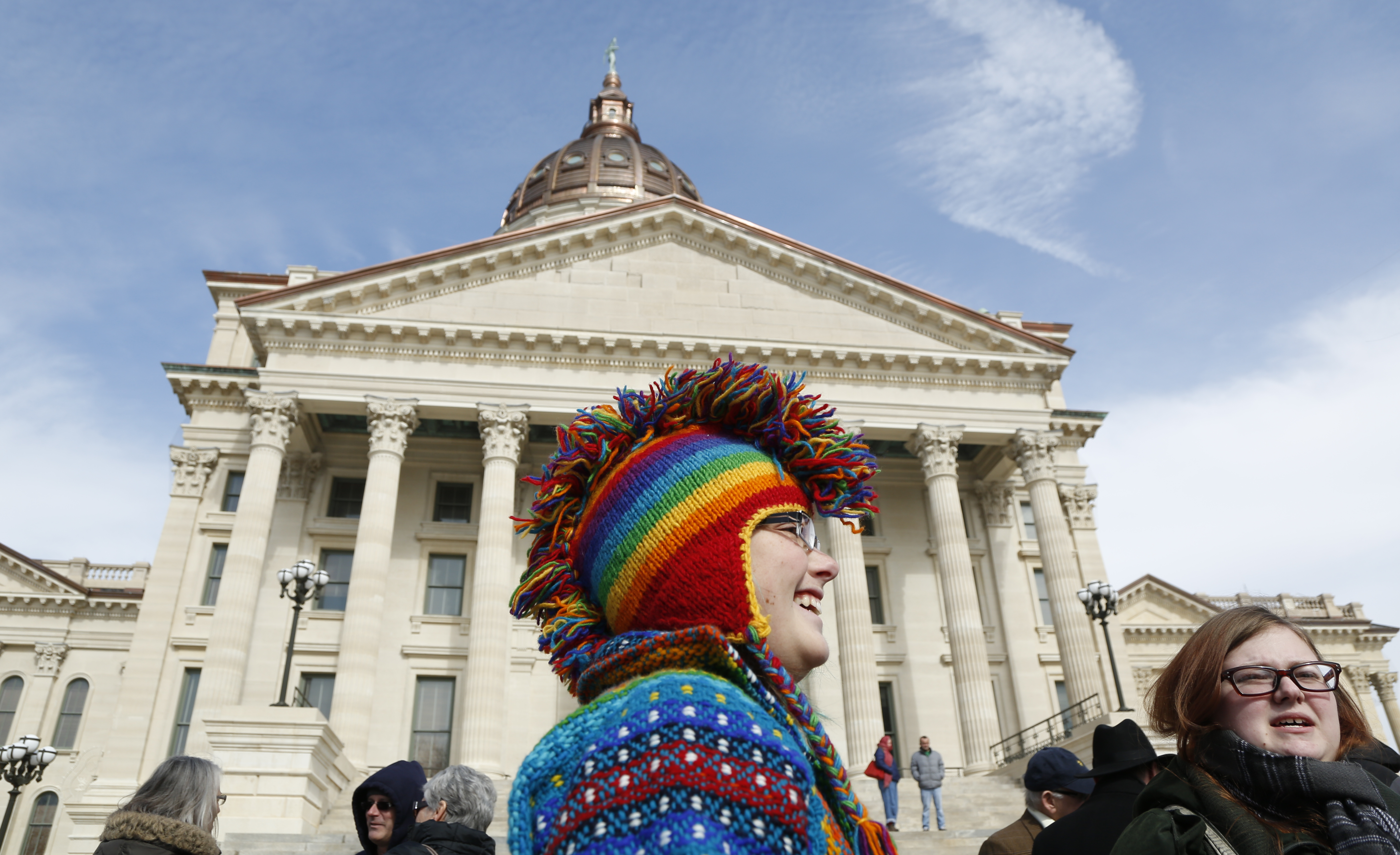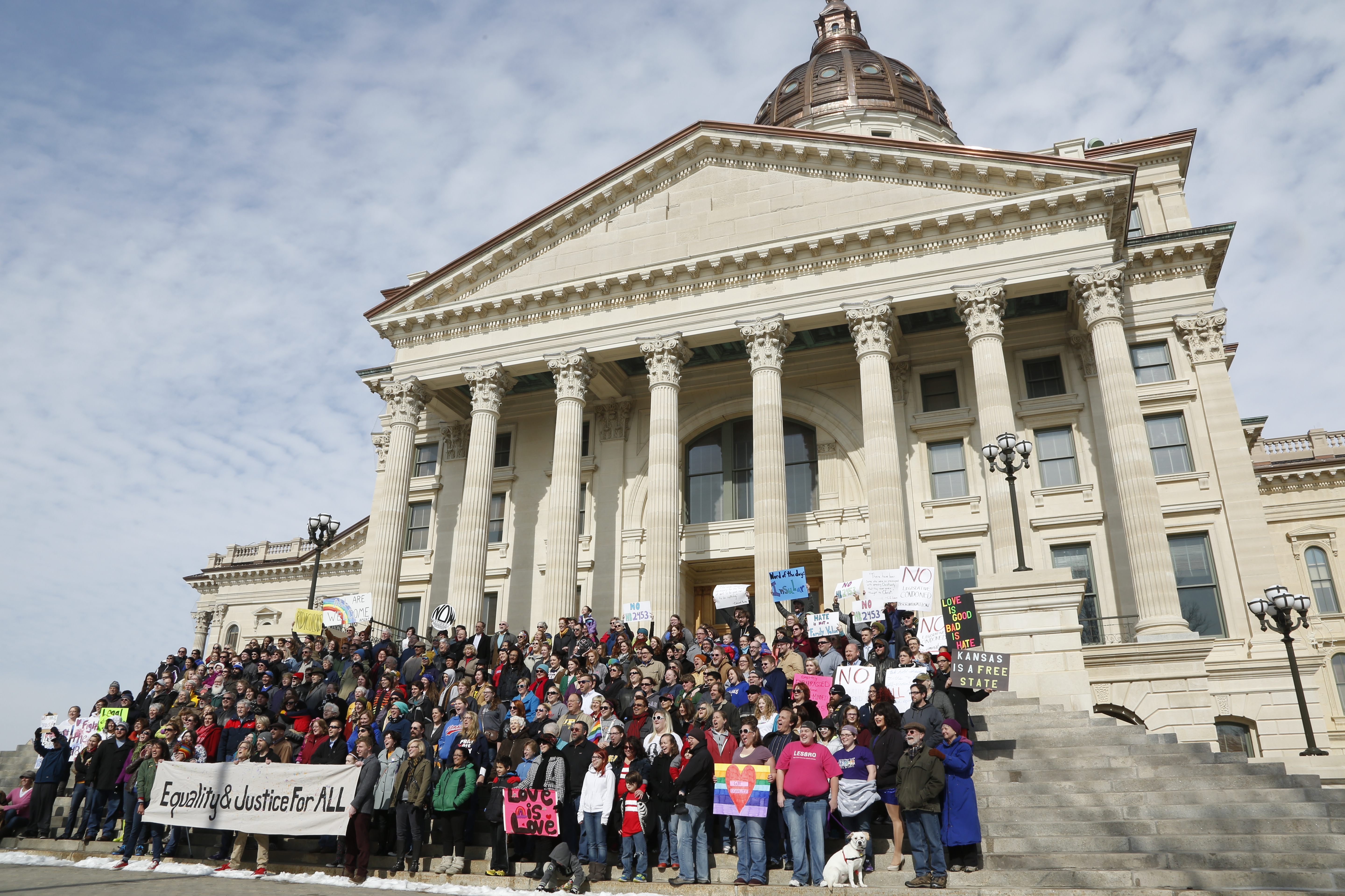 Protesters against discrimination rally at the Kansas Statehouse against House Bill 2453.