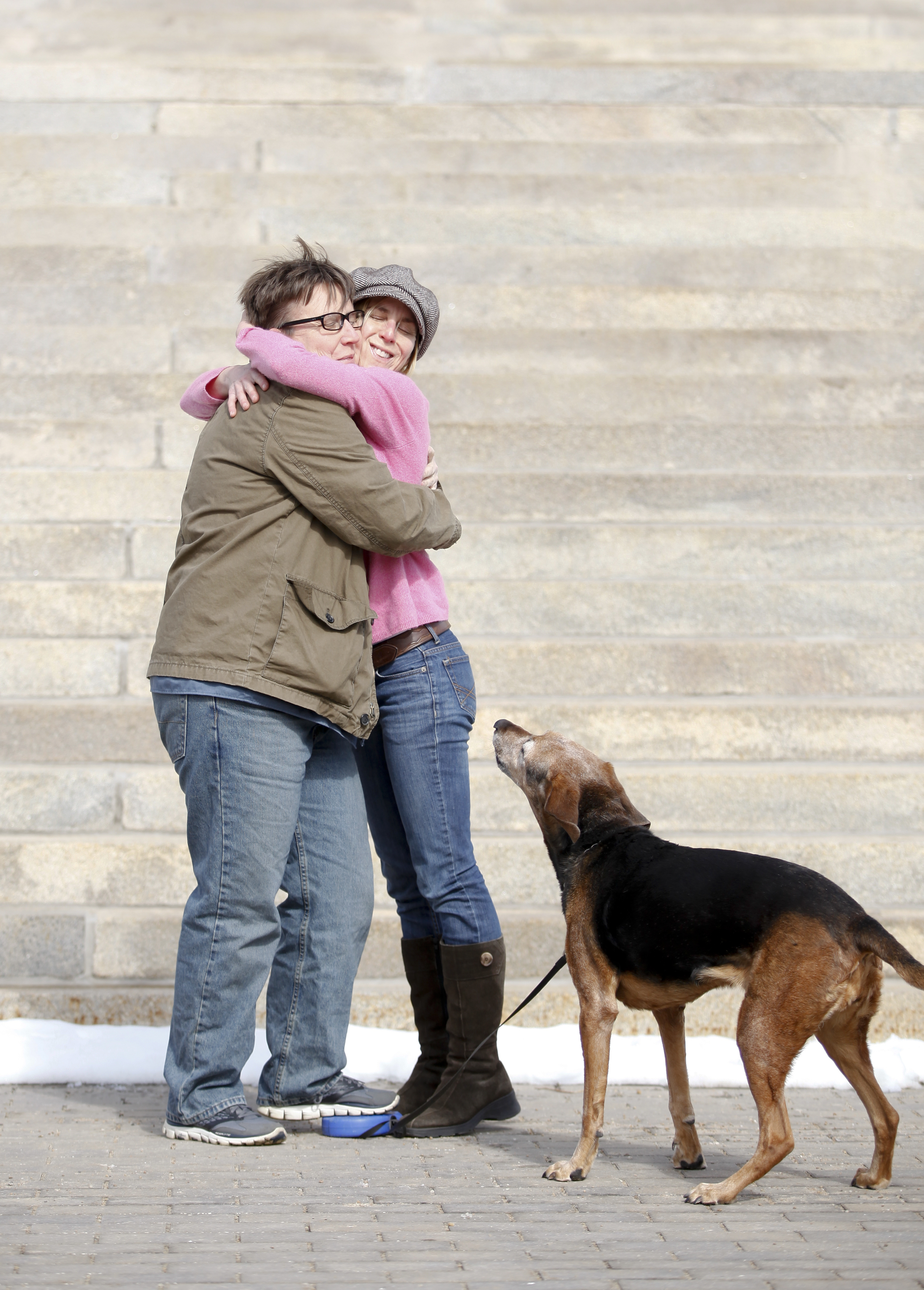 Julie McCarter, right, wraps her arms around her friend, Shauna Kelly, who is in a same-sex relationship, prior to a demonstration on the south side of the Kansas Statehouse in protest to House bill 2453, a measure approved by the House that would have allowed people to cite religious beliefs in denying services to same-sex couples. The demonstration, which drew several hundred members was organized by the Topeka non-profit group Planting Peace.