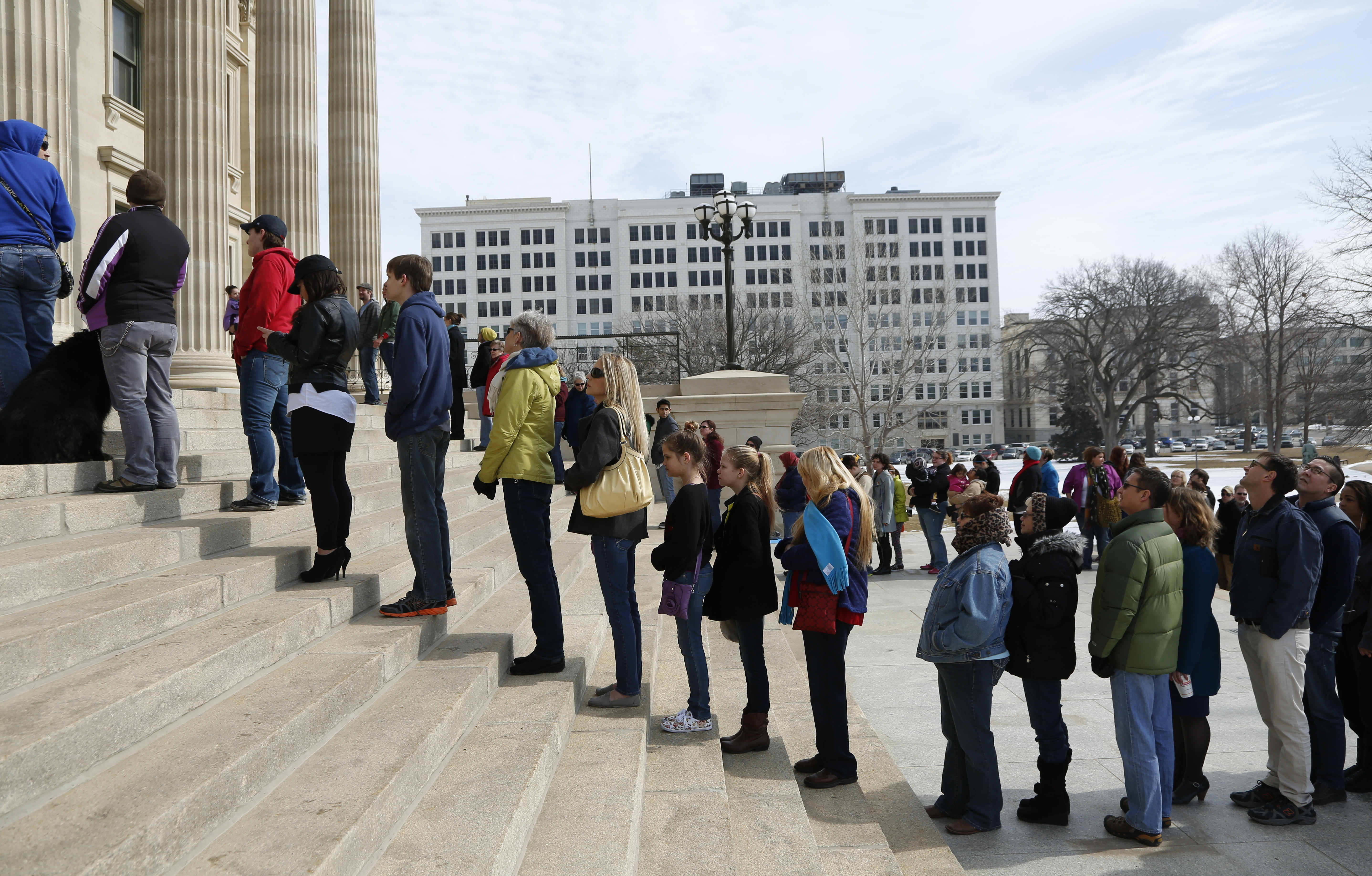 Protesters form two separate lines as a show of the divisions that discrimination creates during a demonstration on the south side of the Kansas Statehouse in protest to House bill 2453, a measure approved by the House that would have allowed people to cite religious beliefs in denying services to same-sex couples. The demonstration, which drew several hundred members was organized by the Topeka non-profit group Planting Peace.