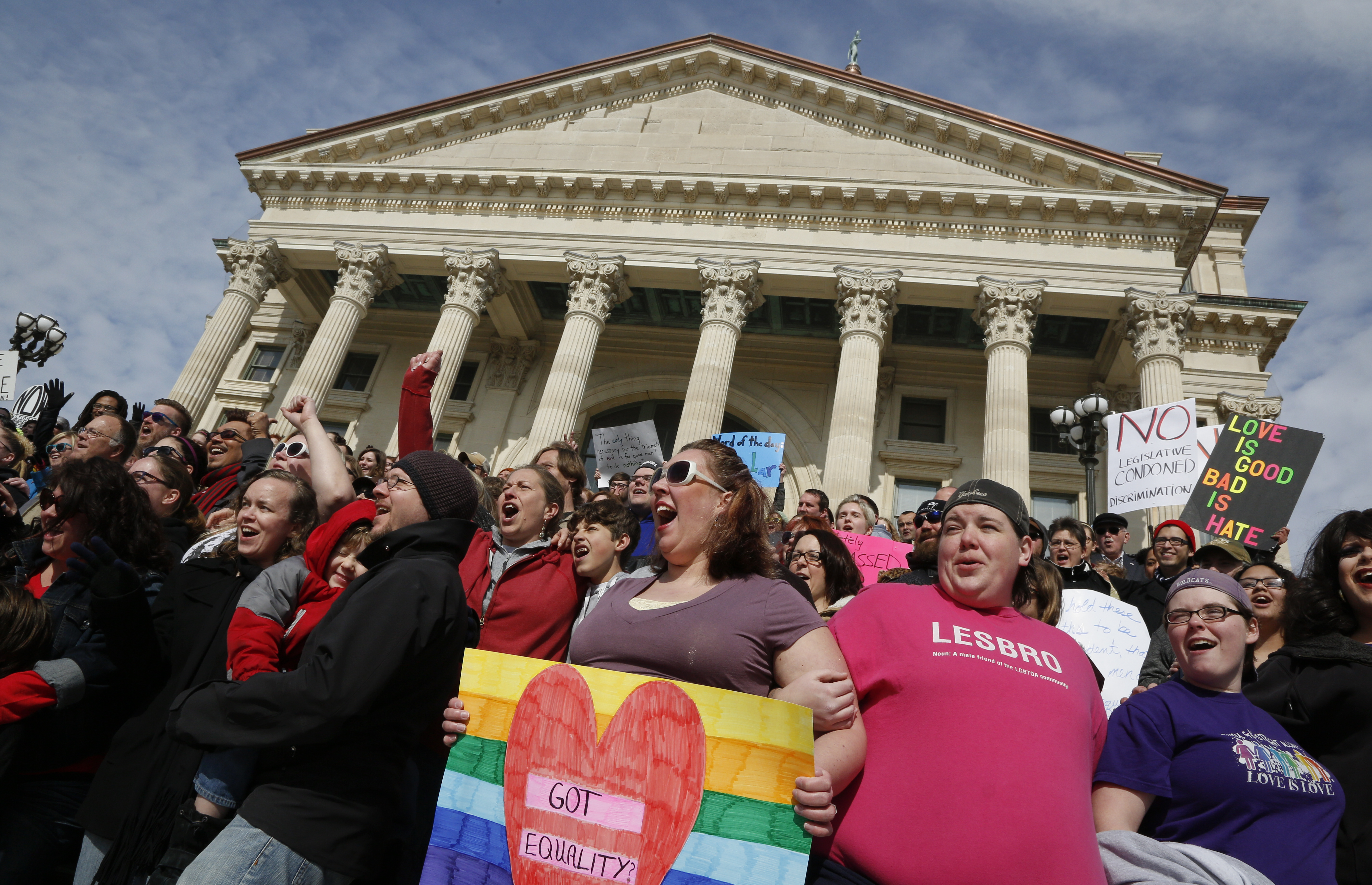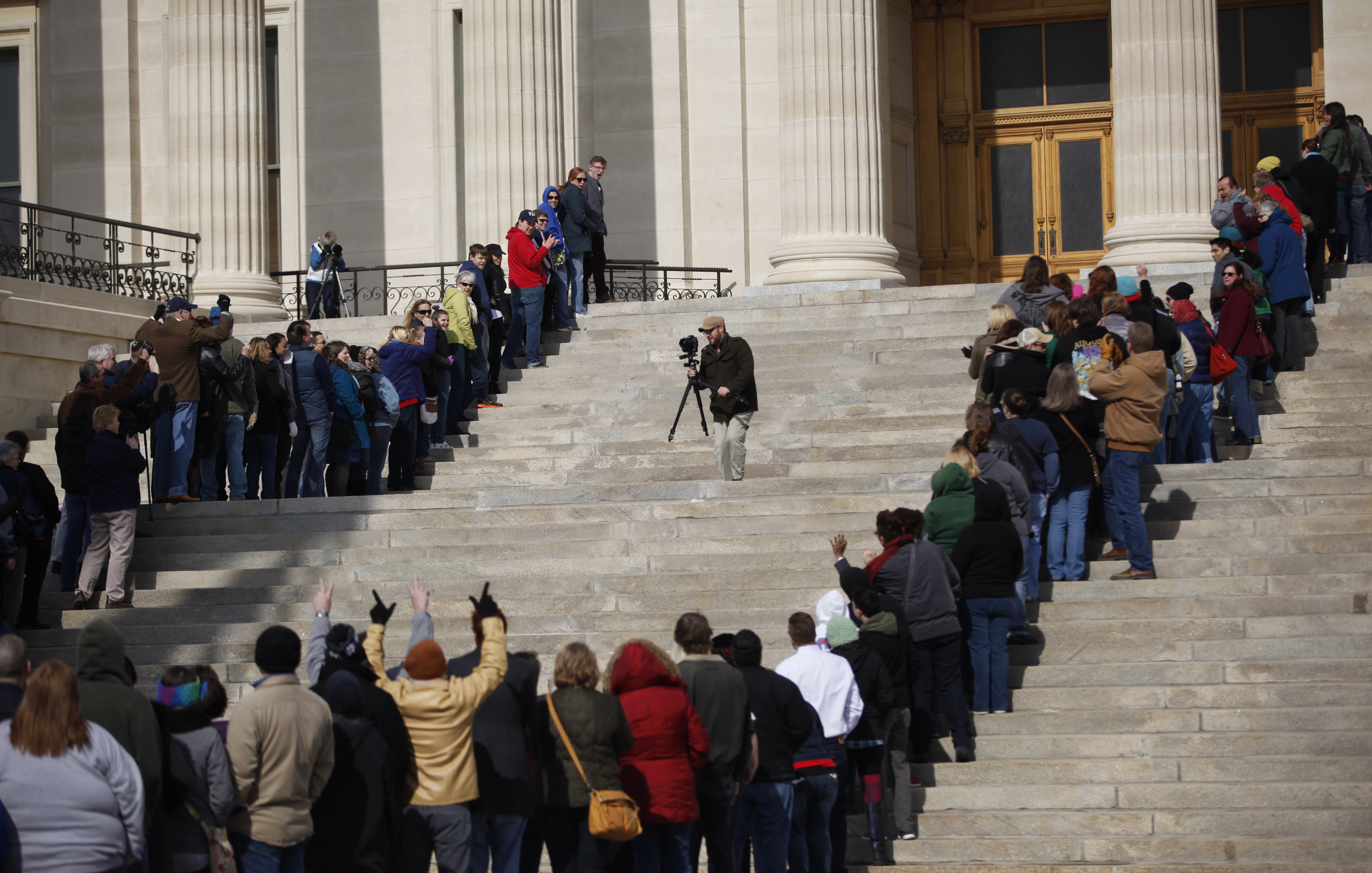 Demonstrators cheers as Colin MacMillan, a videographer films the separated lines leading up the steps of the Kansas Statehouse as a show of the divisions created by discrimination, Sunday, Feb. 16, 2014 in protest to House bill 2453, a measure approved by the House that would have allowed people to cite religious beliefs in denying services to same-sex couples. The demonstration, which drew several hundred members was organized by the Topeka non-profit group Planting Peace.