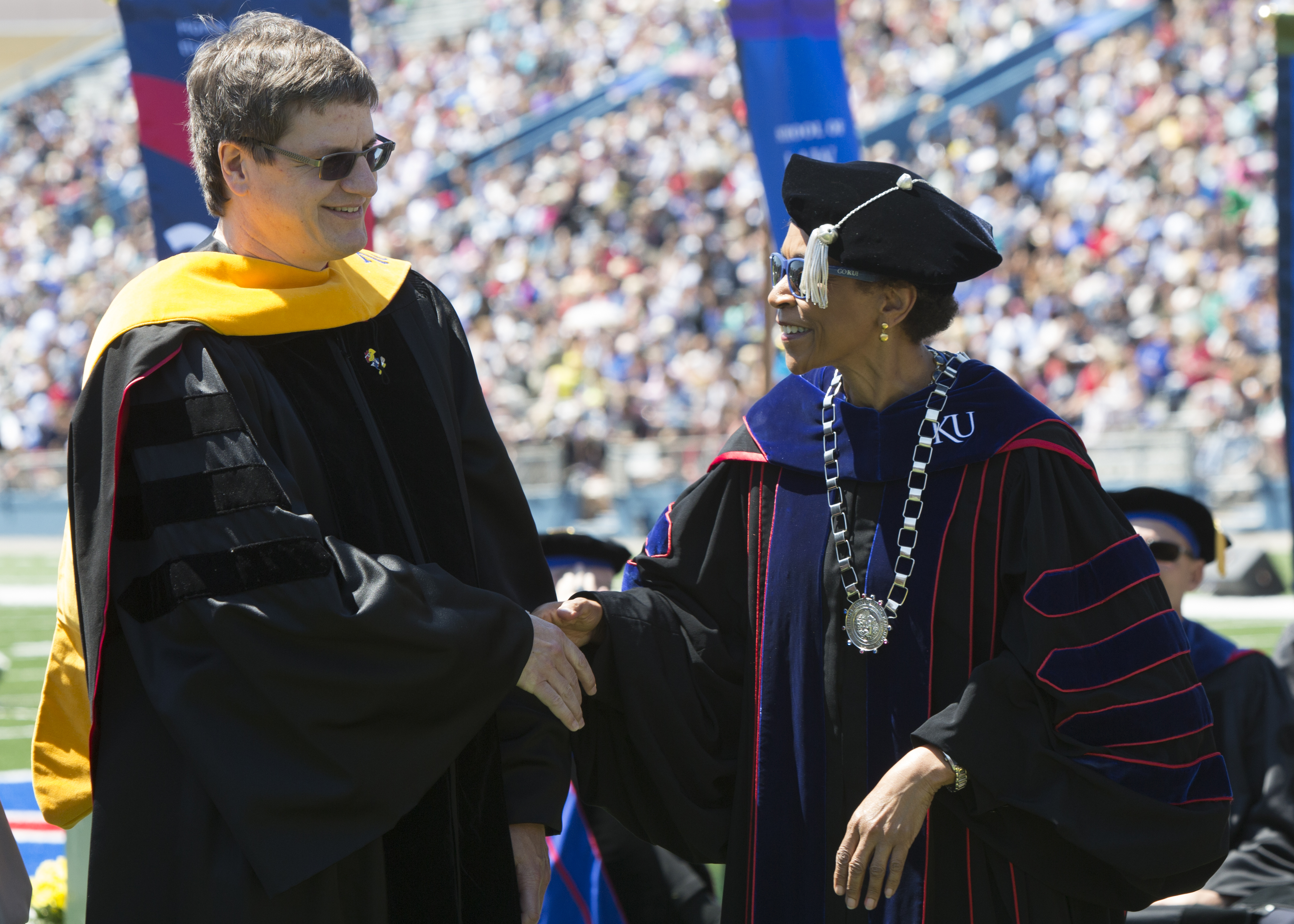 From left, Brian McClendon received a Doctor of Science for outstanding contributions to fields of electrical engineering and computer science from Chancellor Bernadette Gray-Little during KU's 144th graduation on Sunday, May 15, 2016.