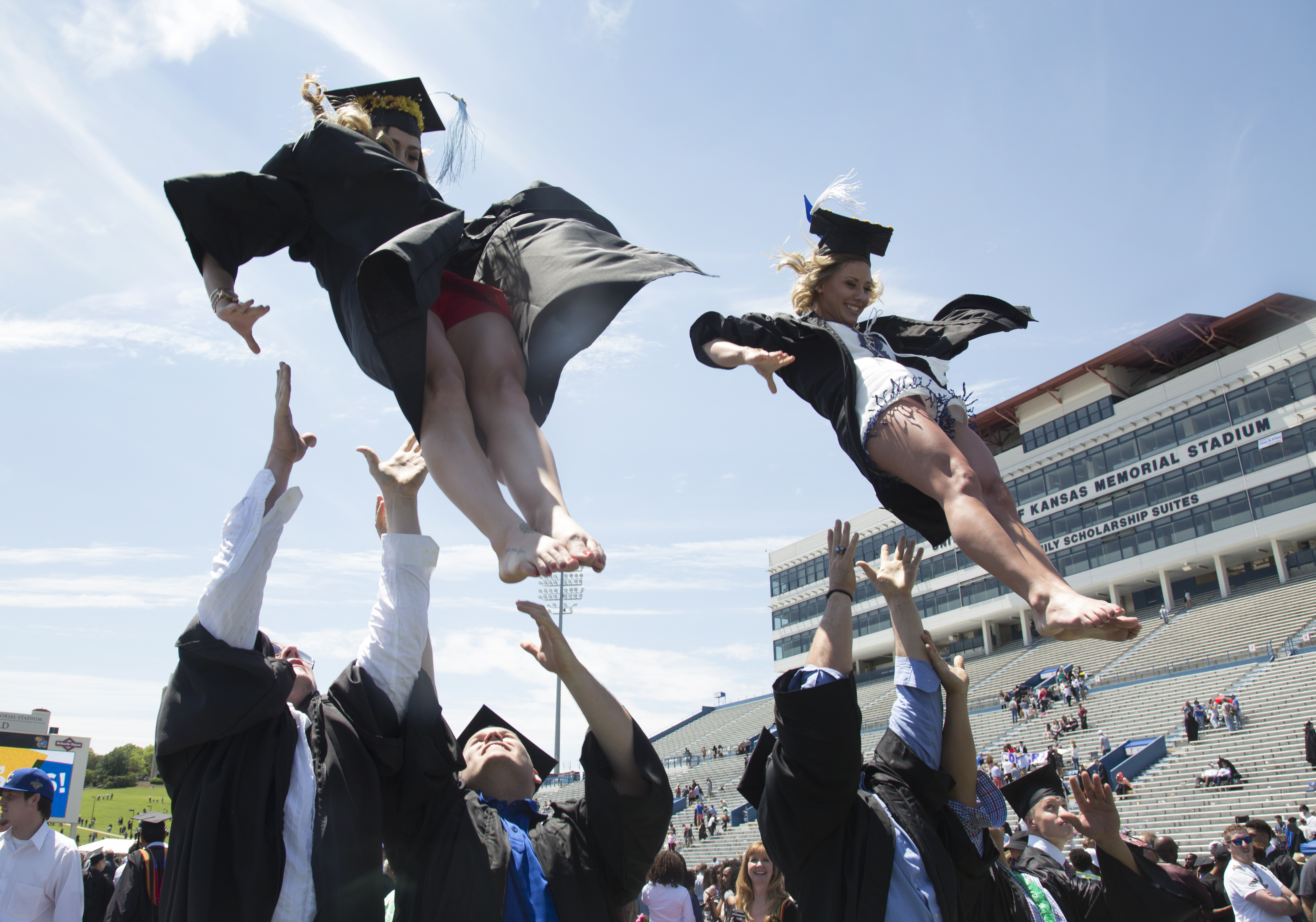 From left, KU cheerleaders Marisa Morris and Carolyn Kipp celebrated in style on Sunday, May 15, 2016 in Memorial Stadium.