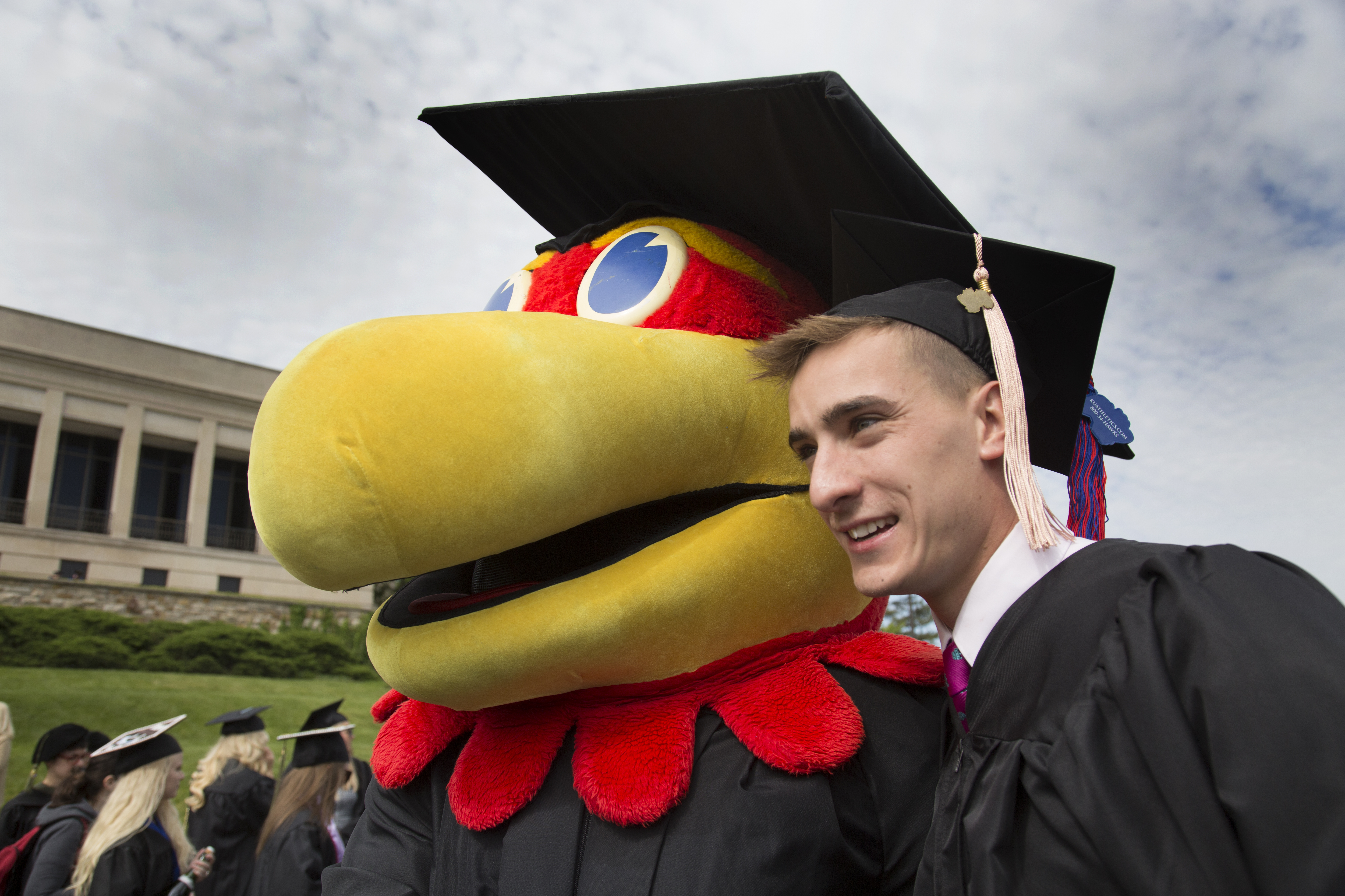 Kansas University graduate Jake Nelson, of Hays, poses for a picture with Big Jay during graduation festivities on Sunday, May 15, 2016, in Memorial Stadium.