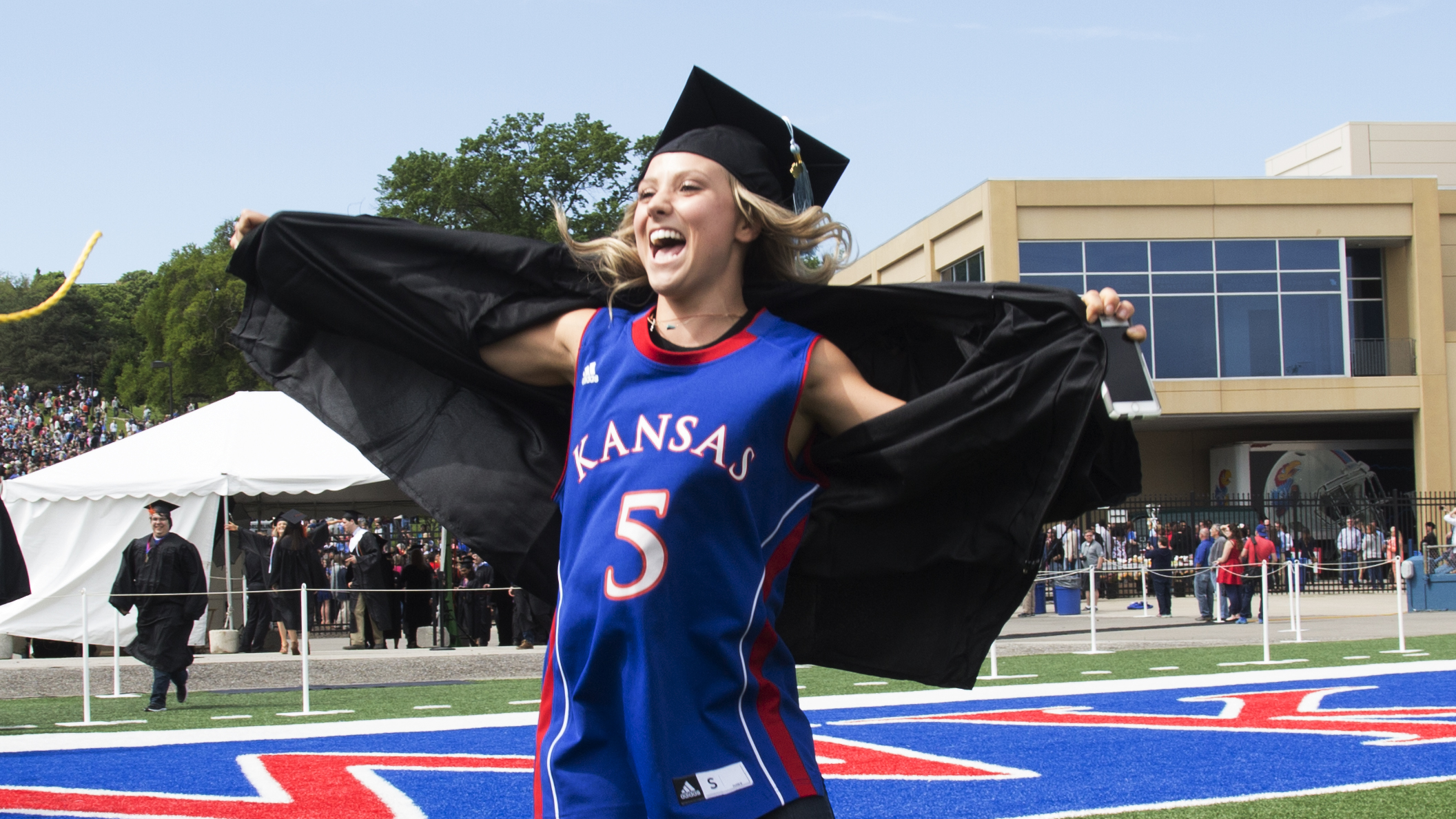 Kansas University graduate Kami Wisdom, of Lawrence, shows off a KU men's basketball jersey she was wearing underneath her gown during graduation on Sunday, May 15, 2016, in Memorial Stadium.