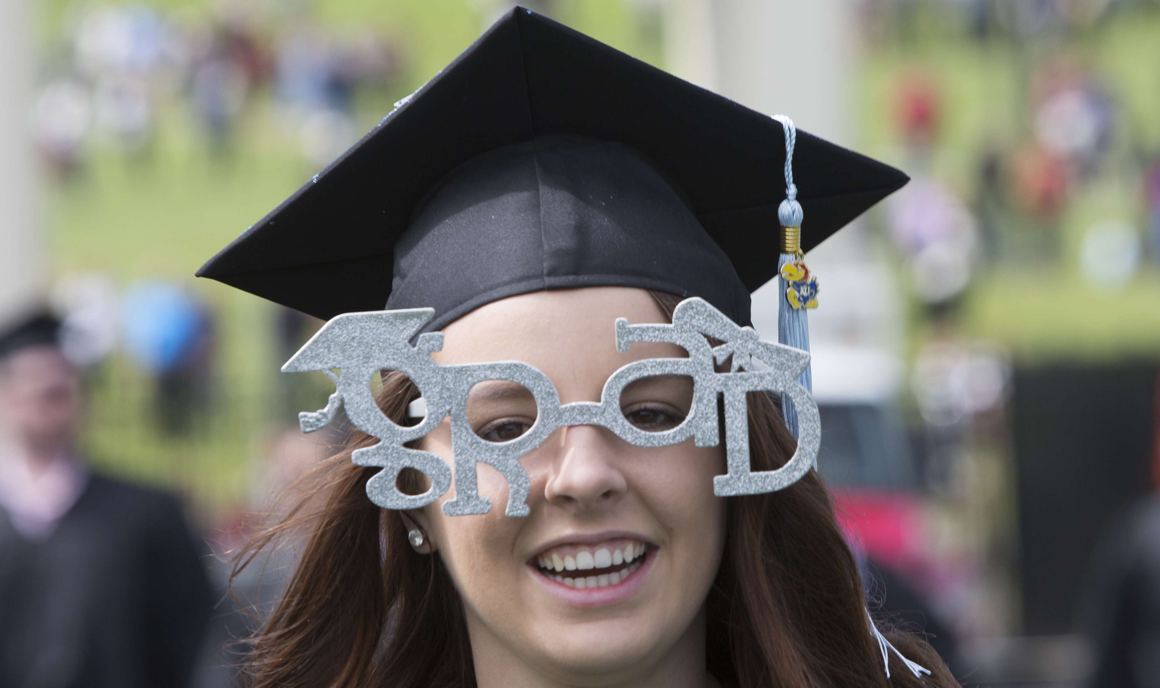 Kansas University graduate Kendra Karlin, of Victoria, shows off her "grad" glasses Sunday, May 15, 2016, in Memorial Stadium.