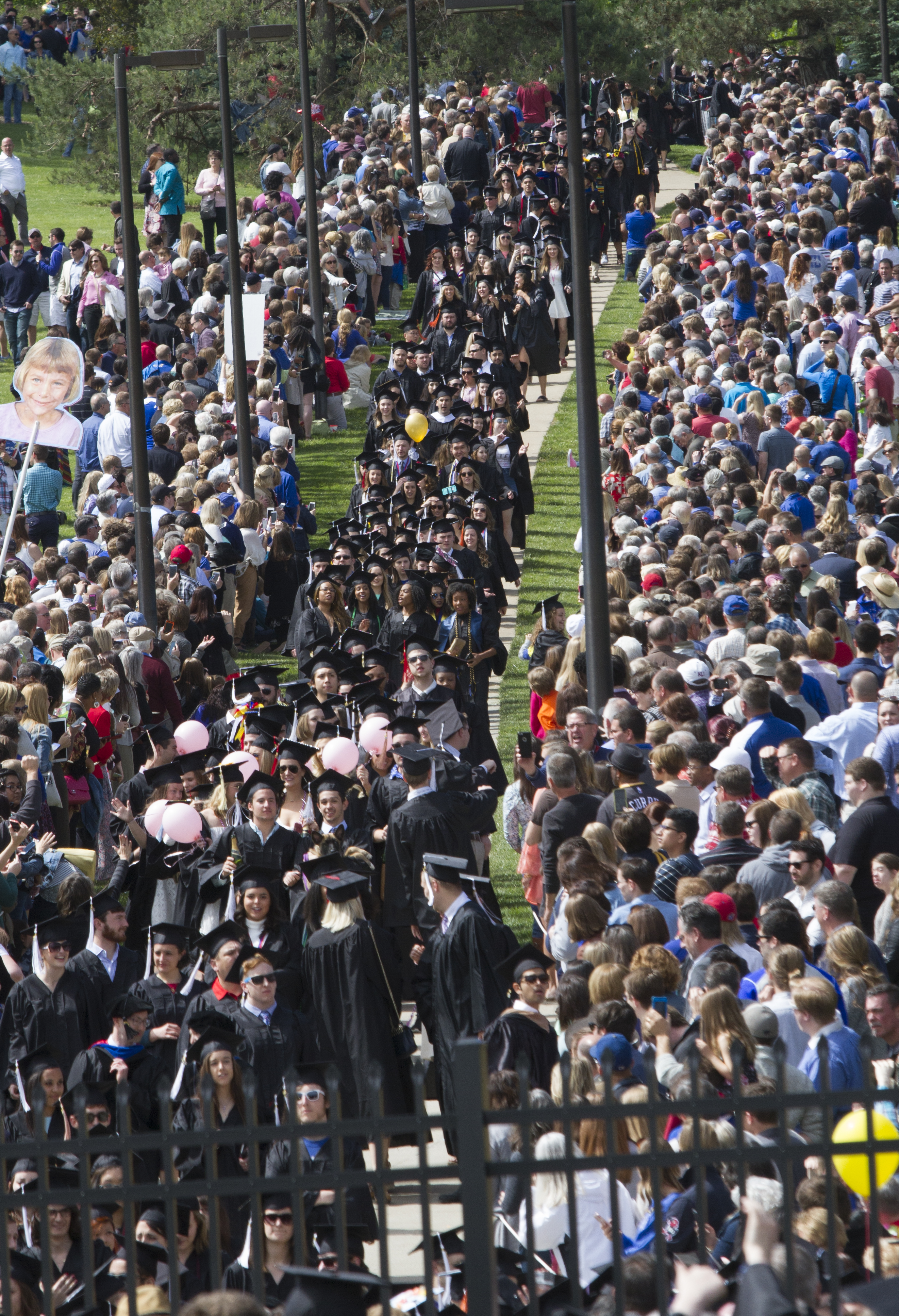 Hundreds of Kansas University graduates walk down Campanile hill toward Memorial Stadium for the commencement ceremony Sunday.