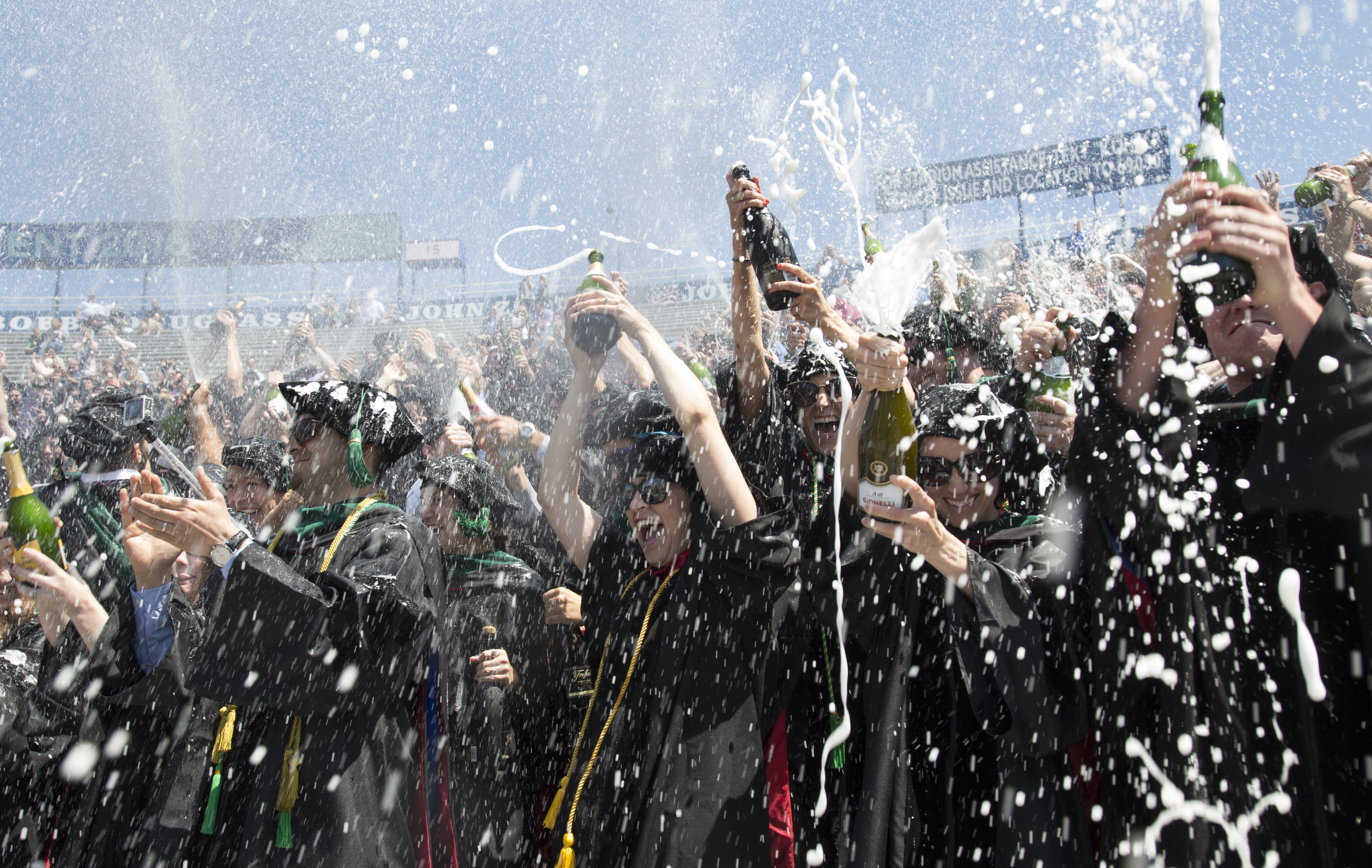 Kansas University School of Medicine graduates spray champagne during the 144th KU commencement ceremony Sunday in Memorial Stadium.