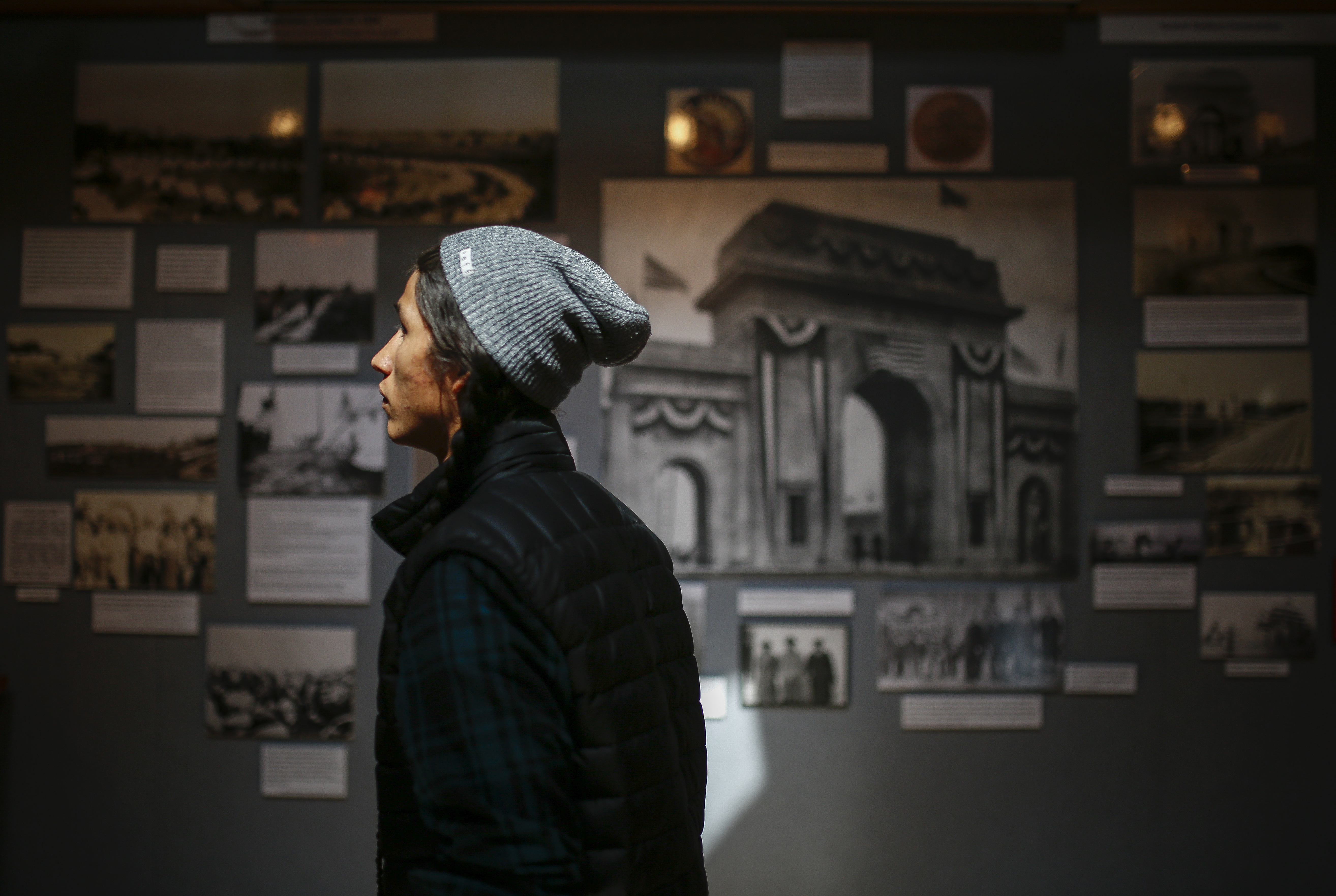 Haskell Indian Nations University freshman Cole Brings Plenty, Lakota, Cheyenne River Reservation, South Dakota, looks through the Haskell Memorial Stadium exhibit on Sept. 14, 2016 at the Haskell Cultural Center and Museum.