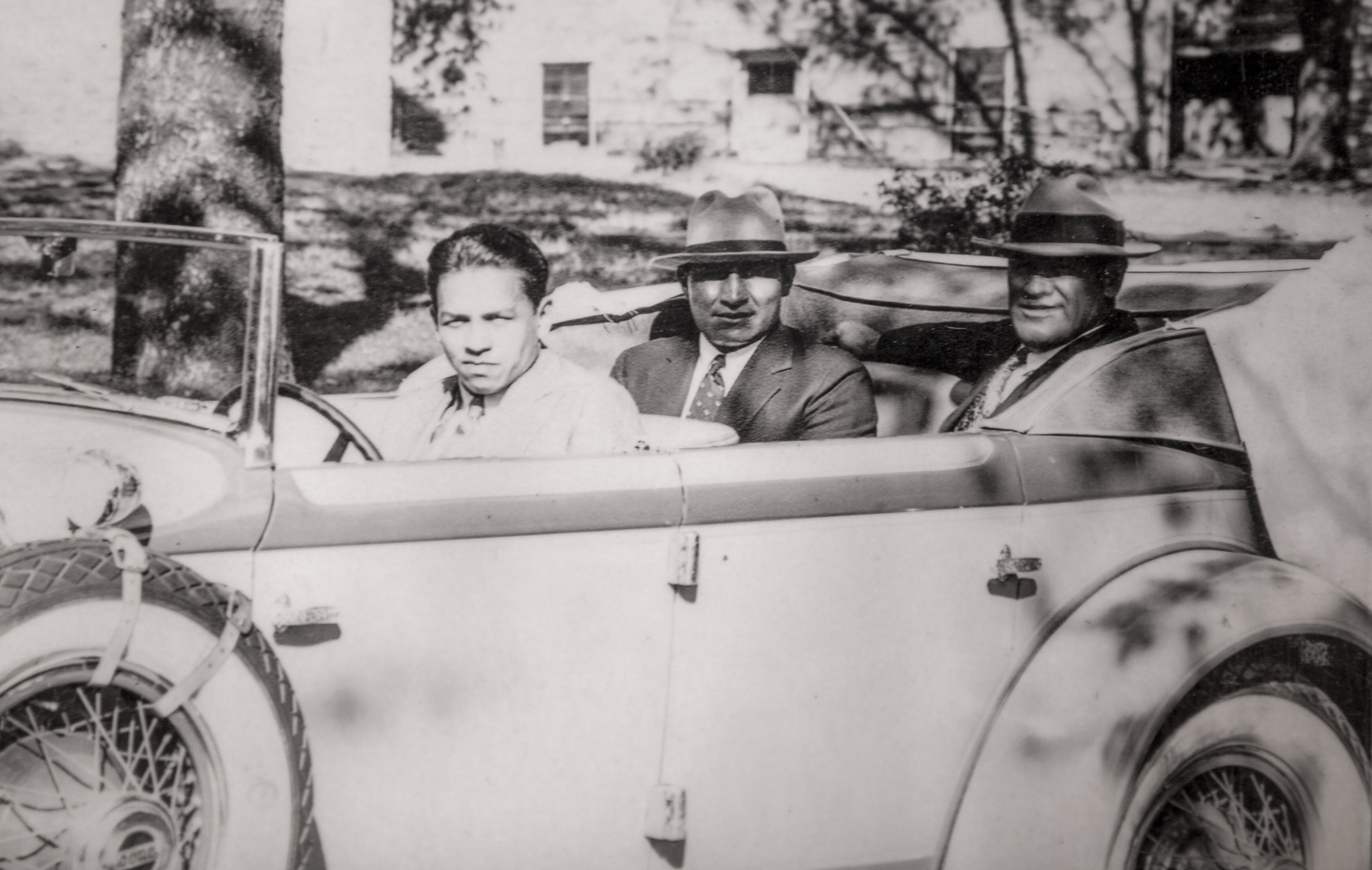 Legendary Haskell alumni Jim Thorpe, back right, and John Levi ride in the back of a car driven by 1932 olympic decathlete Buster Charles.