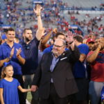 Former Kansas head football coach Mark Mangino and members of the 2008 Orange Bowl team wave to fans as they are recognized during a halftime ceremony, Saturday, Sept. 2, 2017 at Memorial Stadium.