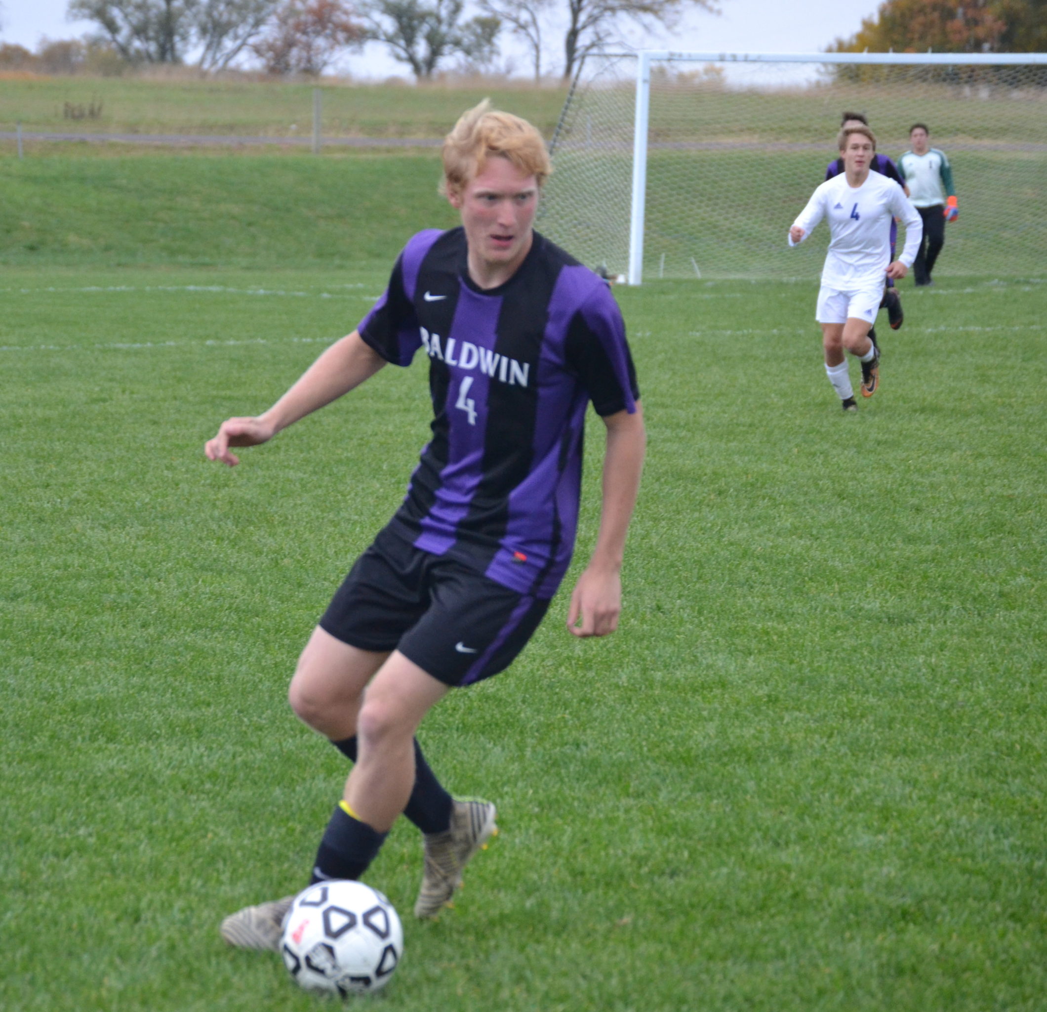 Baldwin senior Dylan Jamison dribbles the ball during a quarterfinals match with Kansas City Christian Tuesday at BHS.