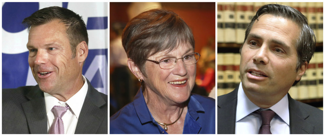 This combination of file photos shows Kansas gubernatorial candidates, from left: Republican Secretary of State Kris Kobach; Democratic state Sen. Laura Kelly; and Independent candidate, businessmen Greg Orman, who are running in the November 2018 election.