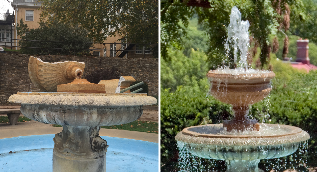 The Alumni Place Fountain on the University of Kansas campus is pictured at left, Monday, Nov. 7, 2016. The fountain was reportedly vandalized and broken sometime over the weekend, according to KU police. The fountain, located partway down the hill behind Miller and Watkins scholarship halls, is pictured at right in a 2014 Journal-World file photo.