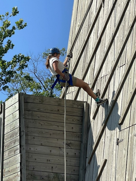 Savanah Hancock participates in rock climbing and rappelling at a Scouts BSA camp.