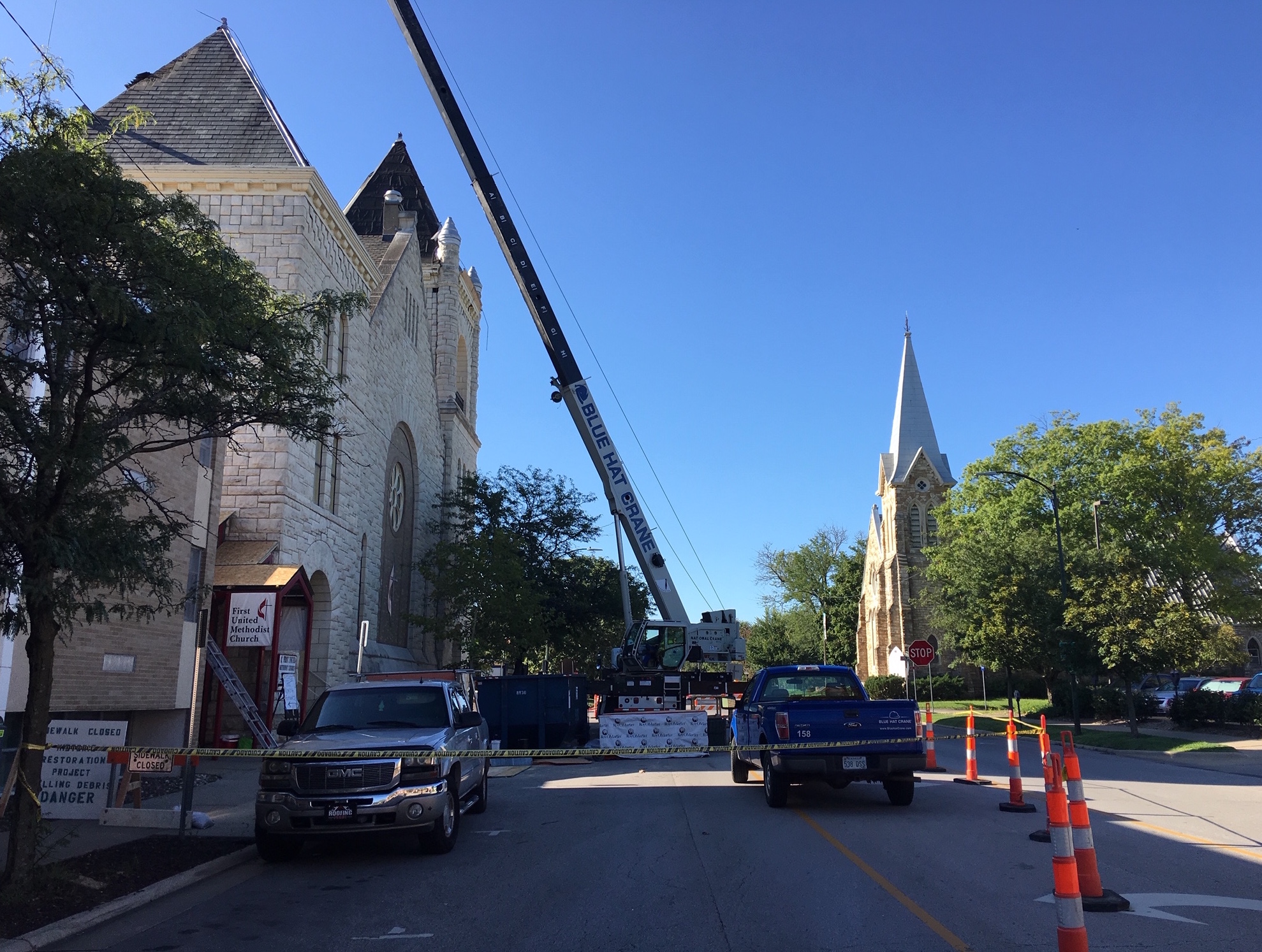 The workers are replacing the 129-year-old slate roof on the limestone church’s two towers, using a crane ...