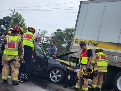 Emergency crews responded to the scene of a vehicle accident Friday morning in North Lawrence in which a car and a semitrailer apparently collided.
