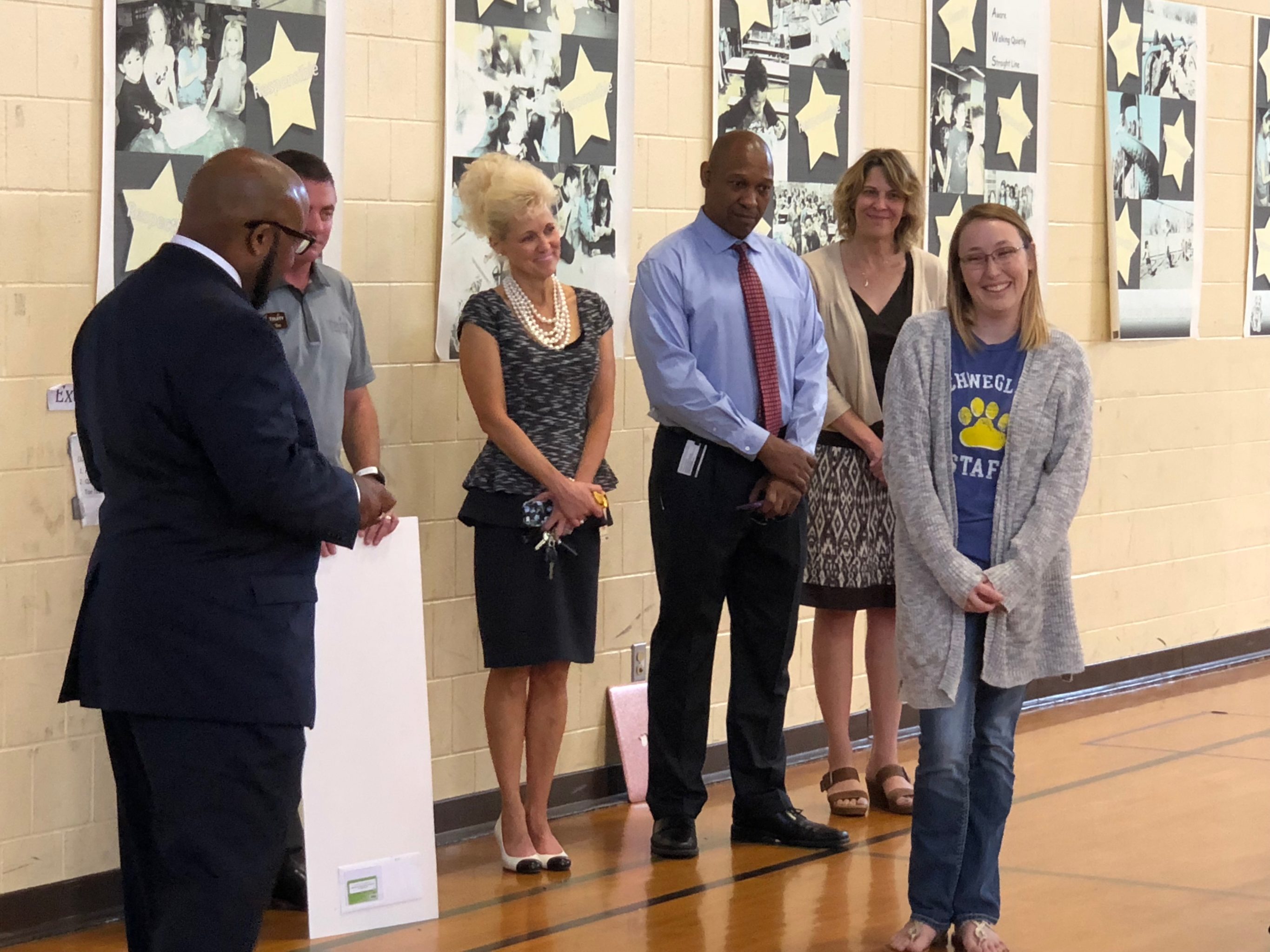 Superintendent Anthony Lewis and other Lawrence school district administrators surprised the school psychologist for Schwegler Elementary by showing up during the school day to announce that she had been chosen as the elementary-level Horizon Award winner.