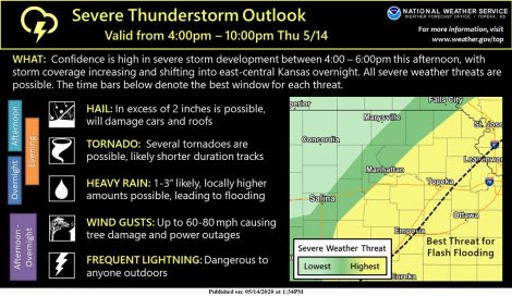 There is potential for hail up to the size of baseballs and wind gusts of up to 60 mph, according to Kyle Poage, a meteorologist with the National Weather Service in Topeka. The severe thunderstorm watch came into effect at 4:25 p.m. Thursday and will last until midnight.