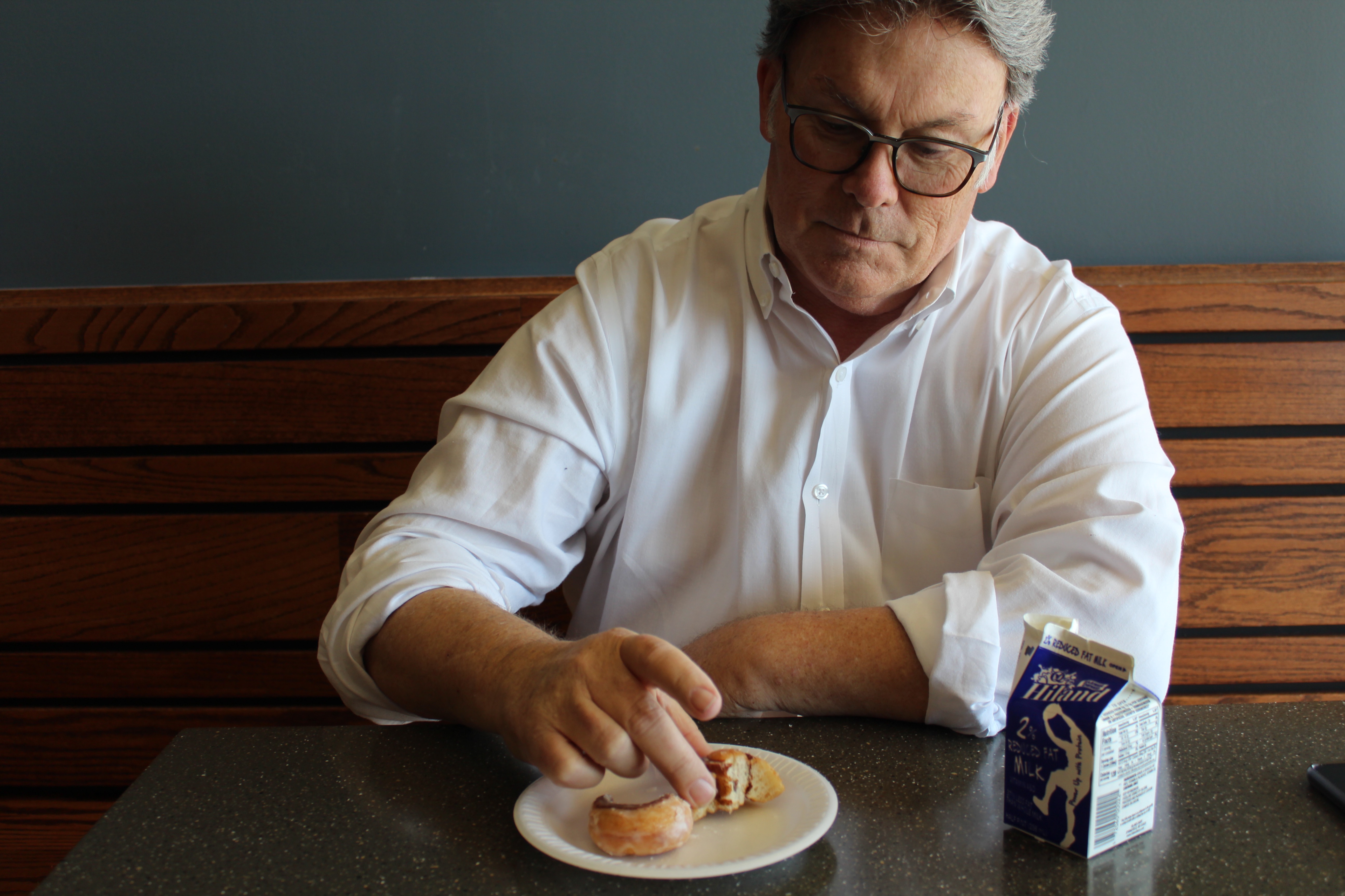“I love doughnuts. It’s terrible, isn’t it?” he says, biting into one of the two miniature cinnamon rolls he ordered, alongside a carton of 2% milk. He ...