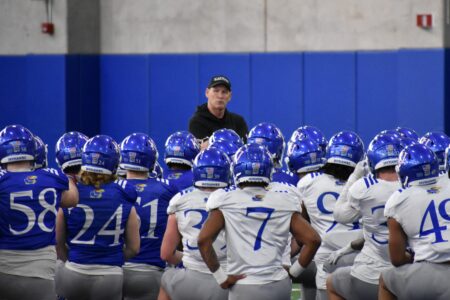 The Kansas football team hadn't gotten more than 20 minutes into the formal portion of its spring practice Tuesday morning when coach Lance Leipold blew his whistle, ordered the music to end and called his players together at midfield.