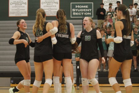 Free State’s volleyball team took a moment to compose themselves after losing the second set of Thursday’s City Showdown against Lawrence.