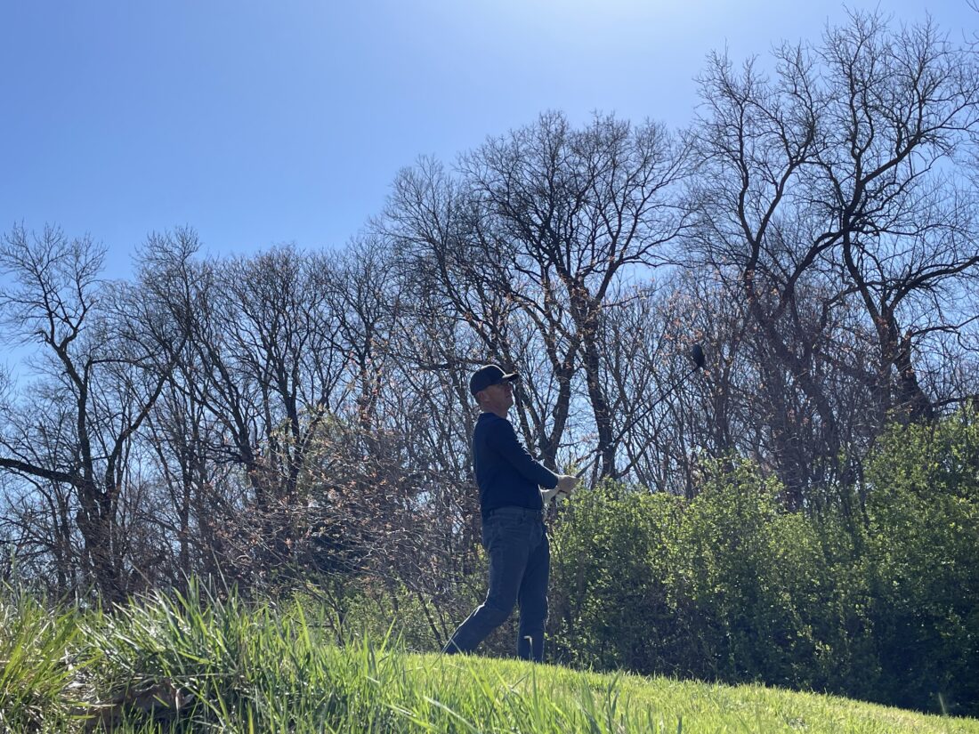 Lawrence Country Club golf pro Chris Thompson prepares to hit his first tee shot of a 96-hole marathon at all 6 area courses to raise money for the Kaw Valley Junior Golf Foundation on Monday, April 18, 2022. Thompson started his day on No. 10 at Eagle Bend and ended at Twin Oaks in Eudora.