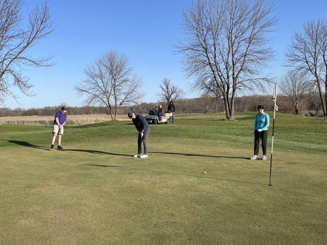 Lawrence Country Club golf pro Chris Thompson rolls one toward the hole at Twin Oaks Golf Course as Olathe West freshman Grady Bruns, left, and Eudora High sophomore Joellen Vogt watch on Monday, April 18, 2022.