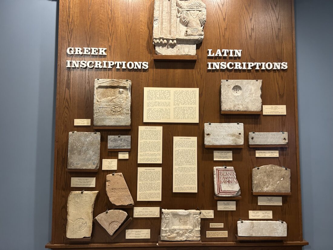 Fragments of marble and other stone that contain inscriptions of Greek and Latin at the Wilcox Classical Museum at KU.