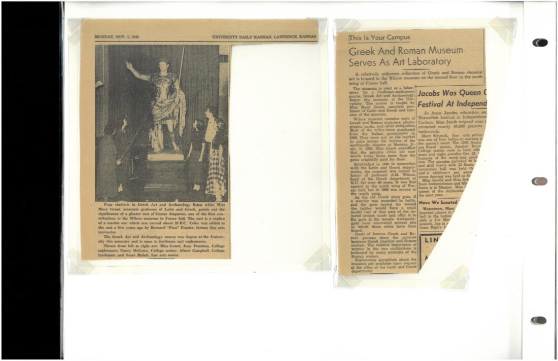 A scan featuring a clipping of an old University Daily Kansan article from 1949 that details the Wilcox Classical Museum.