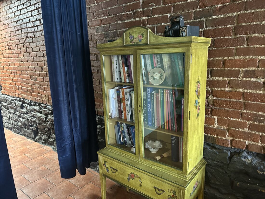 A bookshelf at Meadowlark Wine Bar that features cookbooks. Its owner Jake Moffitt said many of the books featured are from some restaurants or chefs that inspired him.