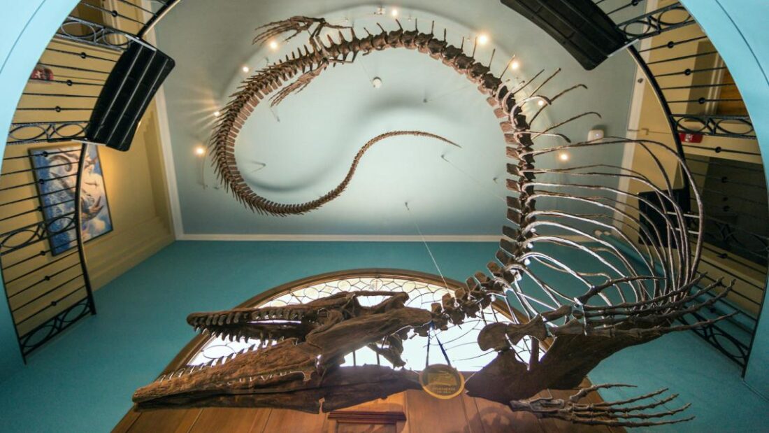 A view of a fossil of a Tylosaurus on display at the KU Natural History Museum. The Tylosaurus is the official marine fossil of the state of Kansas.