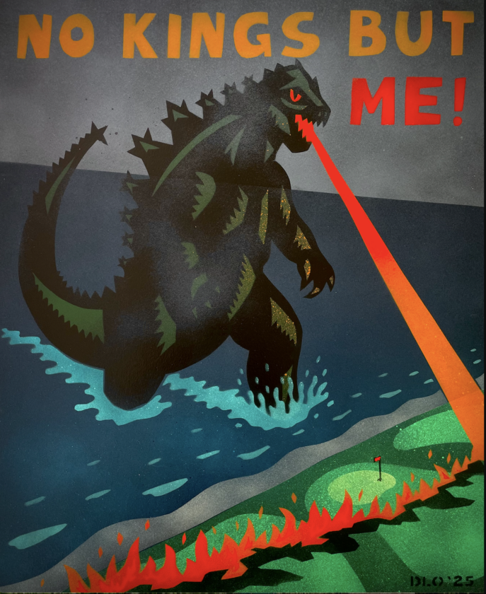 A piece called “No Kings But Me!” made of spraypaint stencil by Lawrence artist Dave Loewenstein. It is one of the works that will be on display during his opening Friday night for an exhibition called “Unless.”