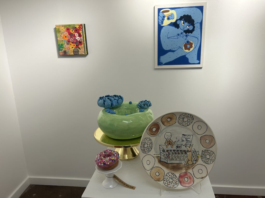 Art on display at the Phoenix Gallery, 825 Massachusetts St., for its “Donut Mind If I Do!” exhibition. The event will have its official opening Friday, with the gallery director saying it’s a “feast for the senses.”
