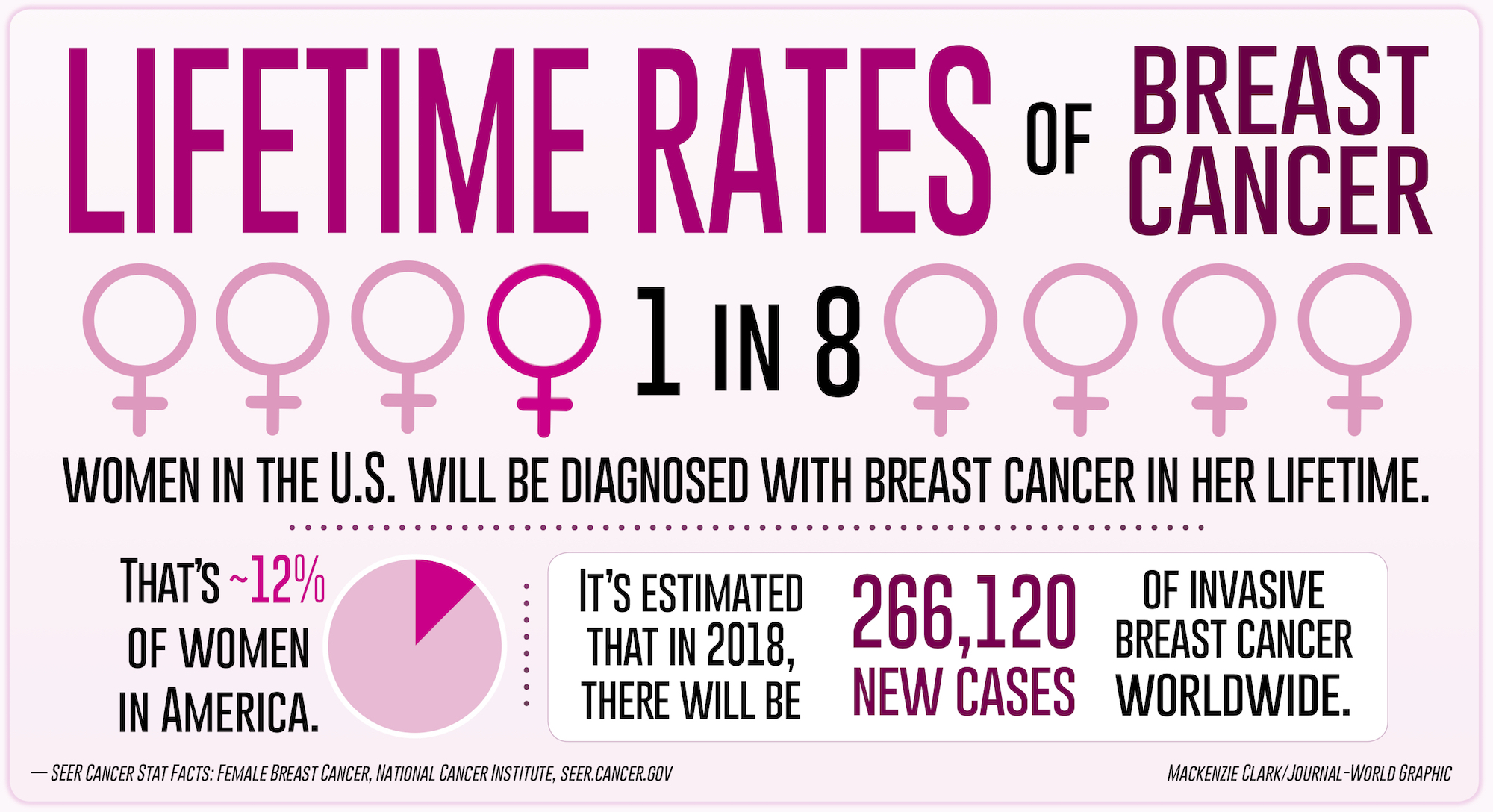 One in 8 women in the United States will be diagnosed with breast cancer in her lifetime, or roughly 12.4 percent. In 2015, there were an estimated 3.4 million women living with breast cancer in the U.S. *