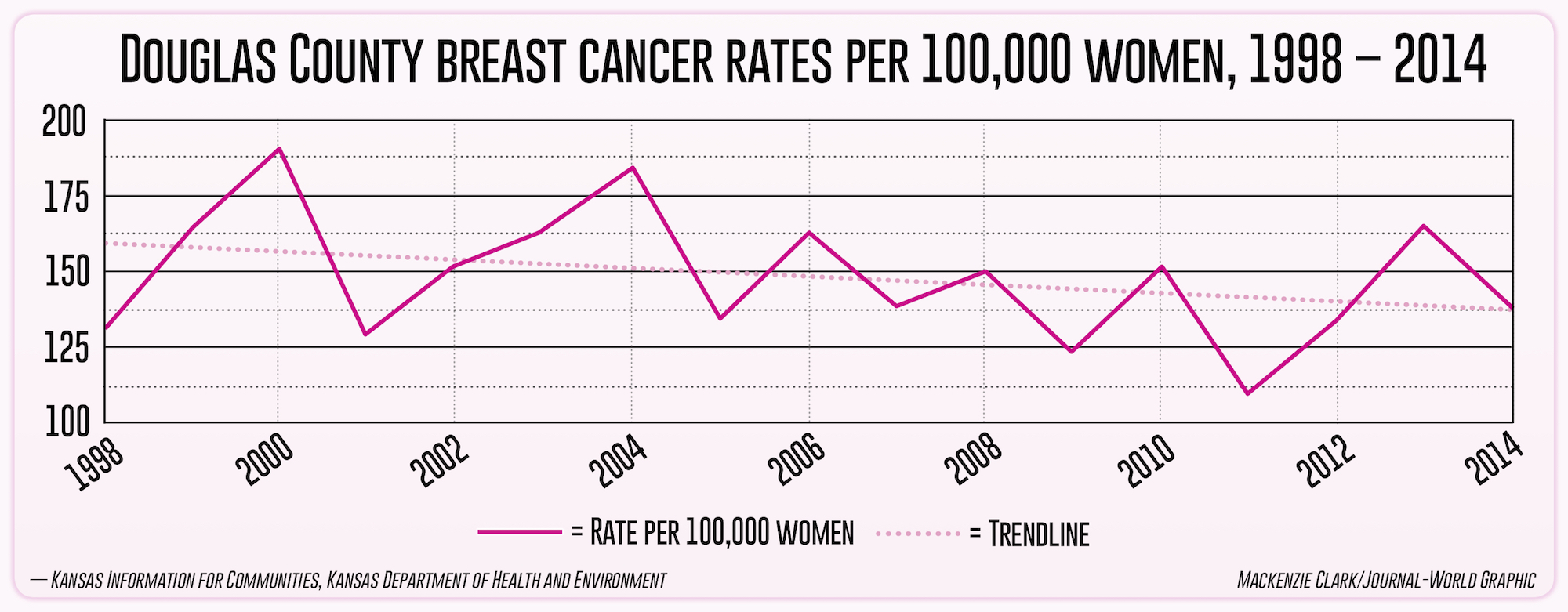 Douglas County breast cancer rates per 100,000 women, from 1998 to 2014, according to Kansas Department of Health and Environment statistics in its Kansas Information for Communities (KIC) service.