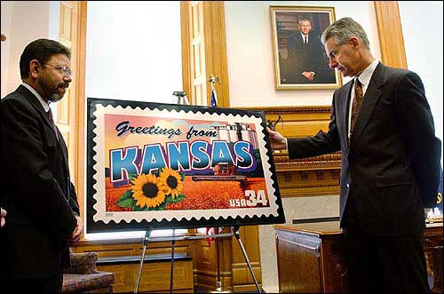 Gov. Bill Graves, right, looks at a poster of a postage stamp that commemorates Kansas. He unveiled it with Sam Gonzales, left, manager of post office operations in Kansas on Thursday at the Statehouse in Topeka. The stamp can be purchased at post offices on a sheet of stamps that feature all 50 states.
