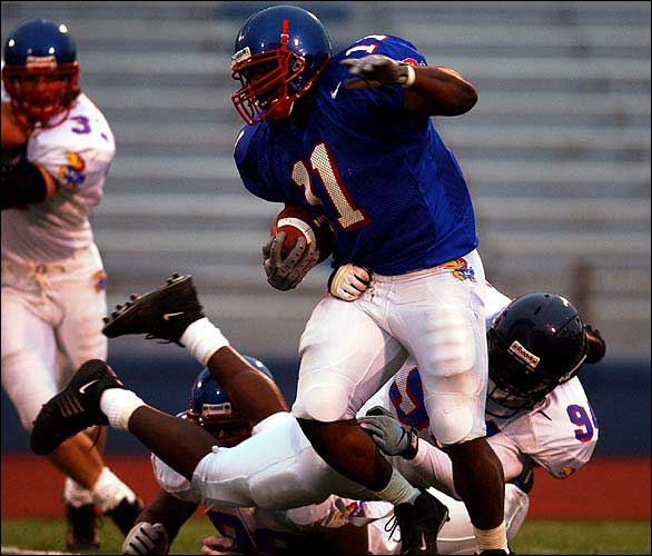 Kansas running back Reggie Duncan (11) tries to escape linebacker Brandon Watkins. Duncan gained a game-high 84 yards on 15 carries during the Jayhawks' spring football game Friday night at Memorial Stadium.