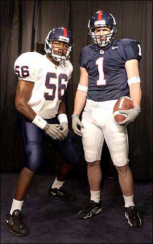 Kansas seniors Greg Cole, left, and Harrison Hill model the Jayhawks' new uniforms in this KU photo. The uniforms were unveiled during halftime of the spring game Friday night. Story on page 3C.