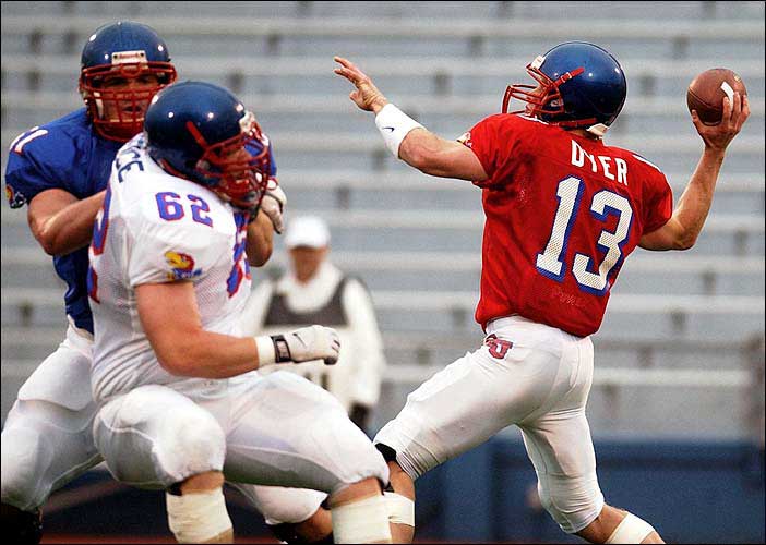 Dyer completed 43 of 89 passes for 460 yards last fall while splitting time with former Jayhawk Mario Kinsey. Dyer finished his sophomore season with more interceptions (four) than touchdowns (three).