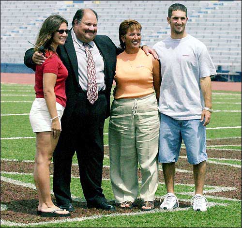 The Mangino family from left, Samantha, Mark, Mary Jane and Tommy pose for a picture at Friday's Media Day at Memorial Stadium.
