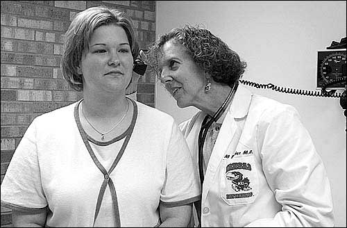 Dr. Myra Strother, right, checks Kansas University student Tami Reid's ear canal during a visit to Watkins Memorial Health Center.