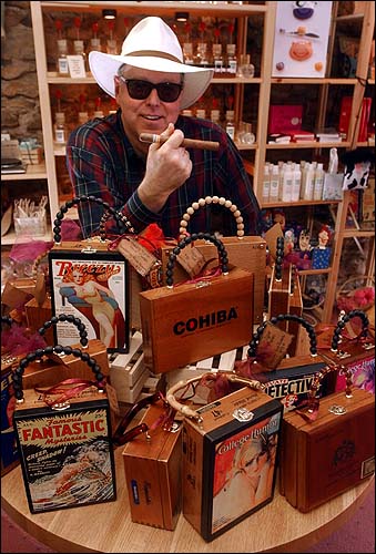 Jerry Bottenfield, owner of Soap Momma, 735 Mass., stands next to his latest creations, purses made from cigar boxes. Bottenfield buys the boxes and puts hinges and handles on them, creating a nostalgic look. He calls them Saucy Sigar Box Purses. They're part of an emerging fashion trend that has women across the country hunting down cigar boxes to make their own purses. The nontraditional handbags sell in upscale boutiques for as much as 00.