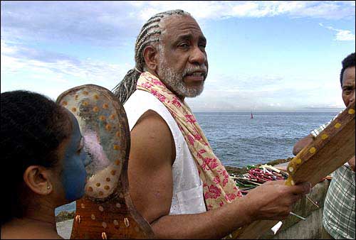 cuban artist manuel mendive, right, prepares for a performance at the Malecon in Havana, Cuba. The performance, organized by Mendive, was to pay homage to Cuban artist Wilfredo Lam on the occasion of Lam's 100th birthday.