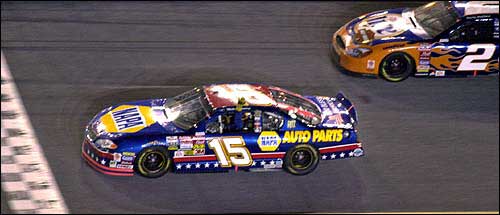 Michael Waltrip waves from inside the No. 15 car as he hits the finish line under caution. Waltrip clipped Rusty Wallace (2) in Pepsi 400 on Saturday night at the Daytona International Speedway in Daytona Beach, Fla.