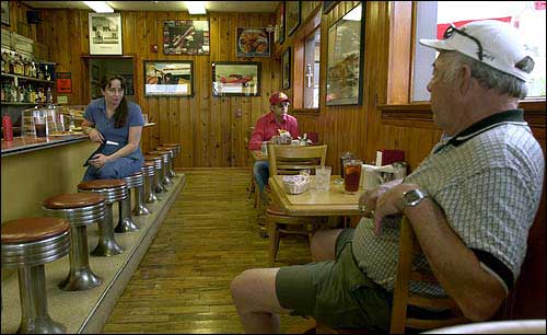 Waitress Judy Klegmann, left, talks to customers Gary Montgomery, center, and Holmer Holmes at the Beaumont Hotel cafe in Beaumont. The hotel, which features a landing strip for fly-in customers, has recently been reopened by a Lawrence hotel company.
