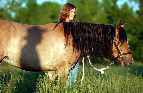 Randy Billinger's shadow is cast against Segura, a Kiger Mustang, in field south of Baldwin as his wife, Kristi, tends to the dun filly. In the summer of 2000, the Billingers brought the first registered Kiger Mustangs to Kansas. Originally brought from the Mediterranean by Spanish conquistadors in the 17th century, the breed is well known for thier stamina, beauty and speed.