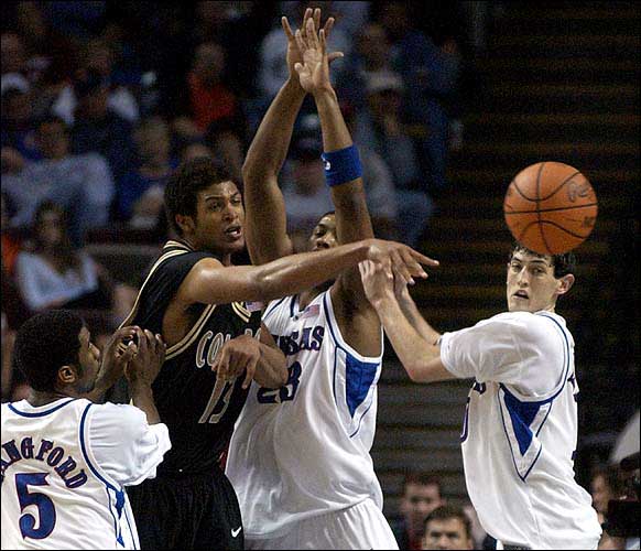 Jayhawks Keith Langford, left, Wayne Simien (23) and Kirk Hinrich converge on David Harrison. KU drilled Colorado, 102-73, on Friday at Kemper Arena.